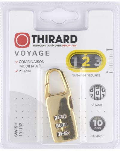 Het SWISH codeslot is ideaal voor het beveiligen van bagage maar ook voor kluisjes, lockers, etc. Het heeft een originele ontgrendeling om de ritsen van koffers en trolleys snel te kunnen openen. Dit veiligheidshangslot heeft een 3-cijferig codeslotsysteem dat 1000 mogelijke combinaties toelaat, traploos herinstelbaar. Dankzij de gegoten legering is het ThIRARD bagageslot zeer licht en het codeslot bespaart je extra sleutels.