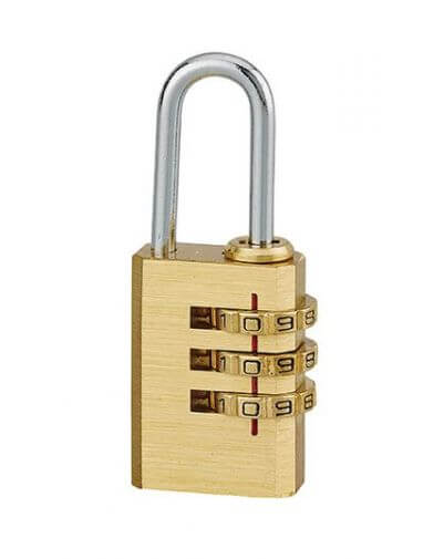 Brass monobloc behuizing. Vernikkeld stalen hek. Mechanisme met 3 ringen. Herinstelbaar cijfer, 1.000 mogelijke cijfercombinaties. Afwerking gepolijst messing.