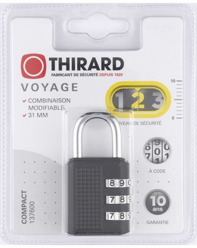 Het COMPACT 03 codeslot is ideaal voor het beveiligen van bagage, kluisjes, garderobes, enz. Het heeft een driecijferig codeslotsysteem dat 1000 mogelijke combinaties toelaat, traploos herinstelbaar. Dankzij de gegoten legering is dit ThIRARD bagageslot zeer licht van gewicht en het codeslot bespaart je extra sleutels.
