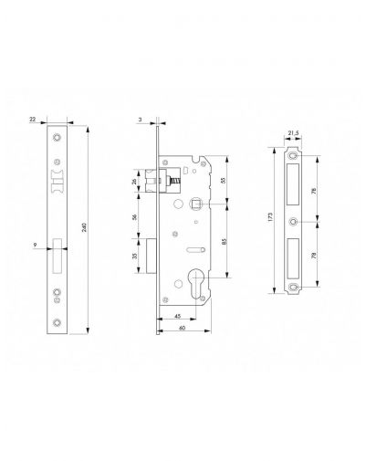Omkeerbaar inbouwslot met antipaniekfunctie en roestvrijstalen tegenplaat. Middenafstand: 45 mm, middenafstand: 85 mm.