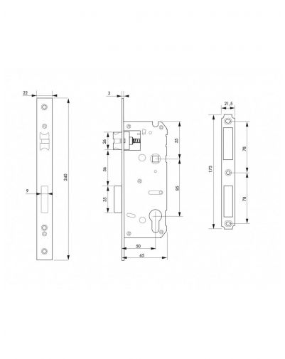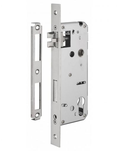 Omkeerbaar insteekslot met antipaniekfunctie en roestvrijstalen tegenplaat. Middenafstand: 50 mm, middenafstand: 85 mm.