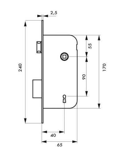 Getrokken stalen behuizing. Stalen voorplaat met afgeronde hoeken. Omkeerbare verende slotbout zonder demontage van de behuizing. Platte gegalvaniseerde legering slotbout. Stalen tegenplaat. Vierkant 8 mm. As 40 mm. Centreerafstand 90 mm. 2 sleutels met groeven.