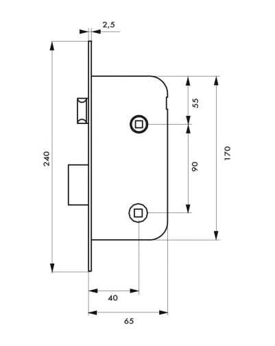Behuizing van gegoten staal. Stalen voorplaat met afgeronde hoeken. Omkeerbare verende sluitbout zonder demontage van de behuizing. Verzinkte platte sluitbout. Stalen tegenplaat. Vierkant 8 mm. As 40 mm. Centreerafstand 90 mm. Gegalvaniseerde afwerking.