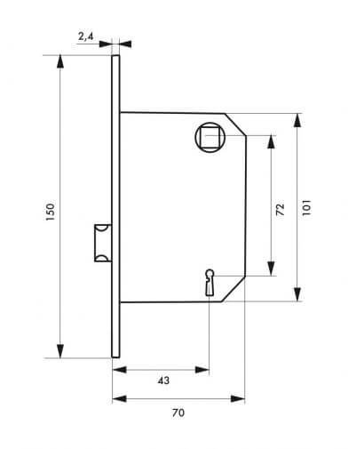 Getrokken stalen behuizing. Stalen voorplaat met afgeronde hoeken. Gegalvaniseerde legering veersluitbout, omkeerbaar zonder de behuizing te demonteren. Stalen tegenplaat. Vierkant 8 mm. As 43 mm. Centreerafstand 72 mm. 1 sleutel met groeven.