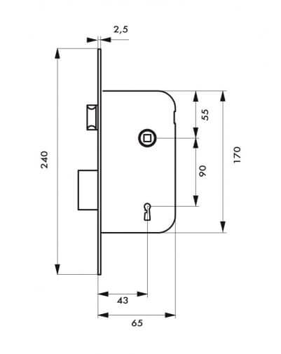 Getrokken stalen behuizing. Stalen voorplaat met afgeronde hoeken. Omkeerbare verende slotbout zonder demontage van de behuizing. Platte gegalvaniseerde legering slotbout. Stalen tegenplaat. Vierkant 8 mm. As 45 mm. Centreerafstand 90 mm. 2 sleutels met groeven.