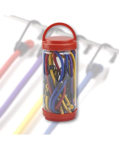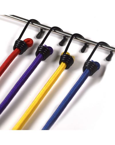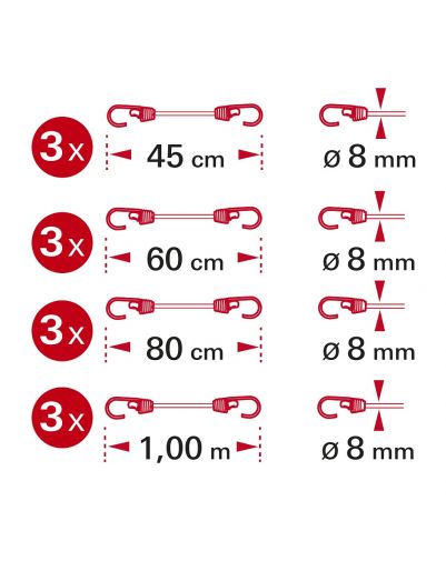 Deze elastische kabelbuis met haken is ontworpen door THIRARD als een zeer nuttig accessoire voor de verschillende toepassingsgebieden waarin deze producten worden gebruikt voor het verankeren en vastzetten van verschillende voorwerpen, tijdens transport of voor opslag: opslag, camping, fietsen, lier, slepen, enz. De set bestaat uit drie kabels van 45 cm lang, drie kabels van 60 cm lang, drie kabels van 80 cm lang en drie kabels van 100 cm lang.