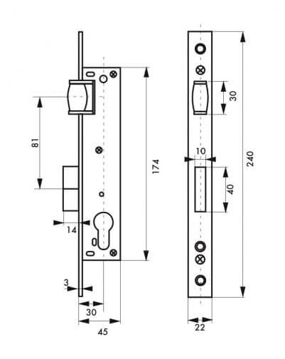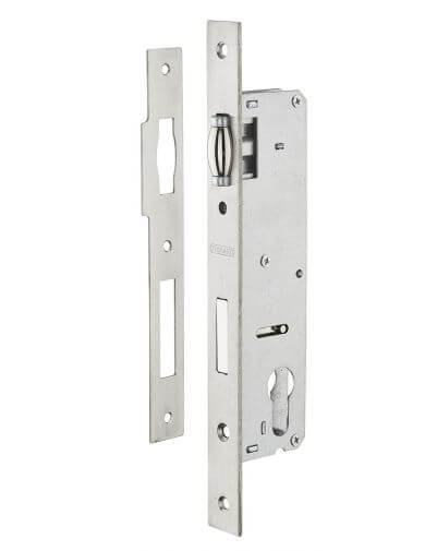 Gegalvaniseerde stalen behuizing. Roestvrij stalen voorplaat. Vergrendelingsgrendel met veerrol. Vlakke nachtschoot in vernikkelde legering. Roestvrij stalen tegenplaat. As 30 mm. Middenafstand 85 mm. Cilindergat met Europees profiel.