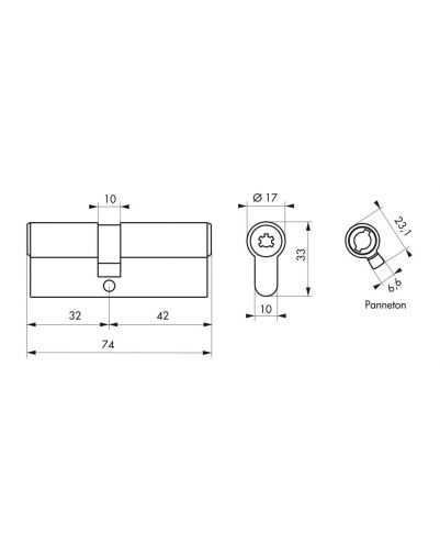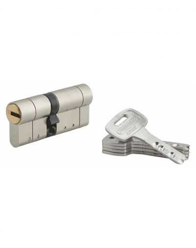 Messing cilinder met Europees profiel, afwerking mat nikkel. Mechanisme met 3 of 4 dubbele telescopische pennen, plus een magnetische pen. Bescherming tegen doorboren. “Valstift”-elementen tegen inbraak door vergrendeling van de rotor. Anti-burstbescherming. Anti-stootbeveiliging. Anti-tampernok. 5 vernikkelde omkeerbare sleutels, met ergonomische ring, met eigendomskaart (kopieën van sleutels kunnen alleen in de fabriek worden gemaakt).