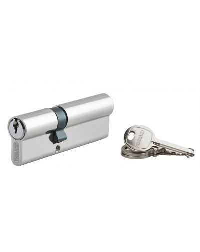 Europese aluminium profielcilinder, vernikkelde afwerking. 5-pins mechanisme. Anti-emissienok. 3 stalen sleutels.