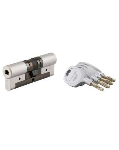Europese messing profielcilinder met matte nikkelafwerking, zeer hoge veiligheid. Mechanisme met 5 axiale veiligheidspompen, met valse groeven tegen openen door een borgring en één radiale pomp. Anti-lek beveiliging. Anti-aanboorbeveiliging. Anti-leknok. 3 gepatenteerde, ergonomische sleutels met eigen kaart voor exclusieve fabrieksreproductie.