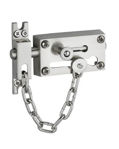 Deze deurklink van THIRARD combineert zowel een solide sluitsysteem met een schuifgrendel als een deurketting om de deur op een kier te vergrendelen, zodat de identiteit van degenen die voor de deur staan gecontroleerd kan worden. Deze veiligheidskettinggrendel heeft een stevige constructie en een stijlvolle afwerking in satijnnikkel en is dankzij de boutbevestiging eenvoudig op elke deur te monteren. Met zijn compacte formaat en hoge sterkte is de veiligheidsketting deurklink een betrouwbaar secundair apparaat voor de beveiliging van huis of appartement.
