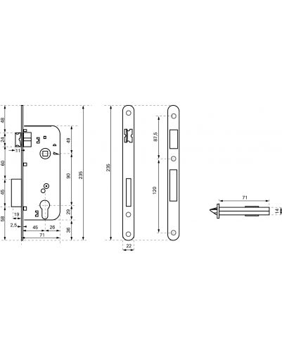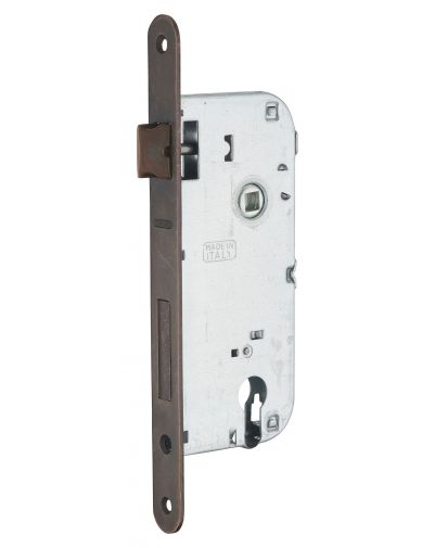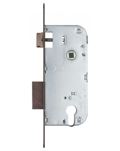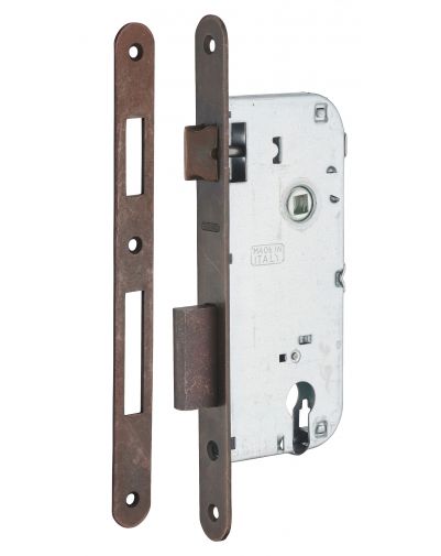 Het slot is gemaakt van reliëfstaal. De tegenplaat en voorplaat hebben afgeronde uiteinden.