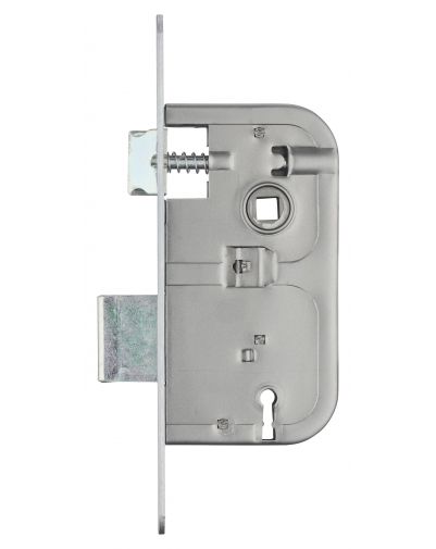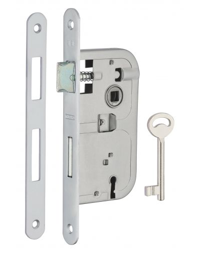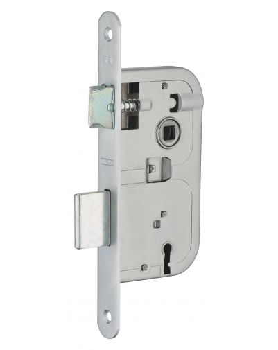 Het slot is gemaakt van reliëfstaal. De achterplaat en voorplaat hebben afgeronde uiteinden.