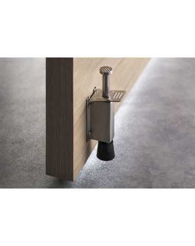 Lichaam van gegoten legering. Rubber rem. Activering met voet. Voor deuren tot 60 kg. Houdt de deur in open positie. Roestvrijstalen afwerking.