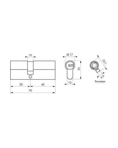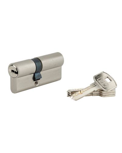Europese aluminium profielcilinder. Mechanisme met 8 pinnen, anti-schok. Gehard stalen pin en pin doorsteekbeveiliging. Bescherming tegen lekken en breken. Anti-breuknok. 4 omkeerbare vernikkelde messing sleutels met eigendomskaart.