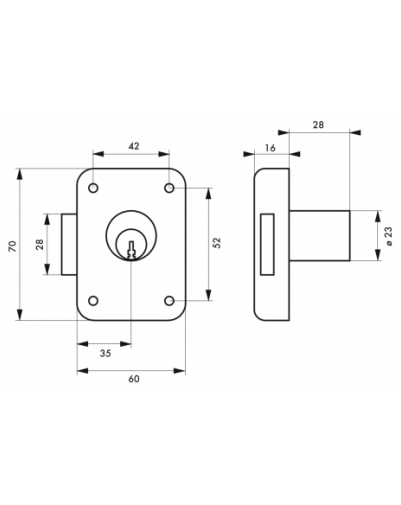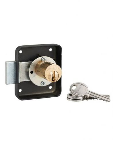Slot voor meubels. Stalen kast en tong. Messing cilinder. Met 5 pinnen. 3 sleutels van vernikkeld staal.