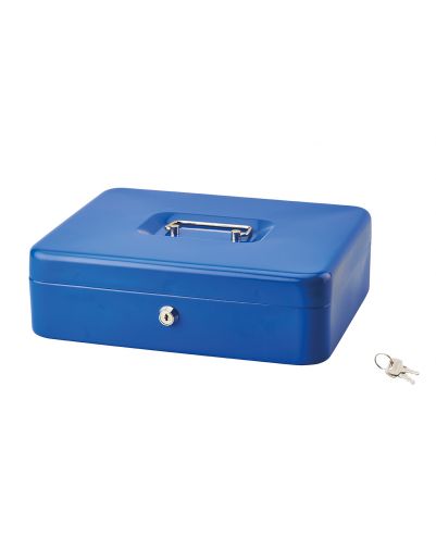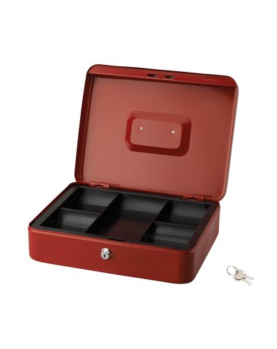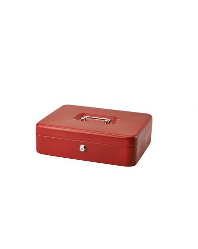 Getrokken staal, verchroomd handvat. Cilinderslot (2 sleutels inbegrepen). Uitneembaar PVC binnenvak voor muntgeld. Diverse kleuren.