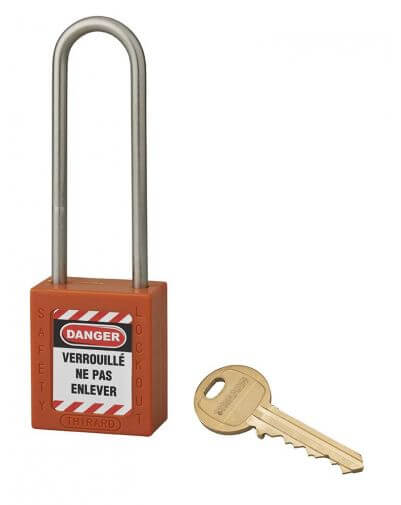 THIRARD veiligheidsslot, ideaal voor elektrische toepassingen, met een behuizing van ABS (niet-geleidend materiaal) en een roestvrijstalen deur, waardoor het bestand is tegen schokken, hitte en corrosie. Voor nog meer veiligheid beschikt dit industriële hangslot over een pinmechanisme en dubbele vergrendeling, evenals een ‘captive key’-functie (het hangslot moet gesloten zijn om de sleutel te kunnen verwijderen). Geleverd met een sleutel en een set labels. Optie om de automatische vergrendeling en ‘captive key’-functie op te heffen. Deze industriële veiligheidshangsloten hebben dezelfde opening, op verzoek is er de mogelijkheid om ze op te nemen in het hoofdsleutelsysteem, maar ook om individuele sleutels te leveren.