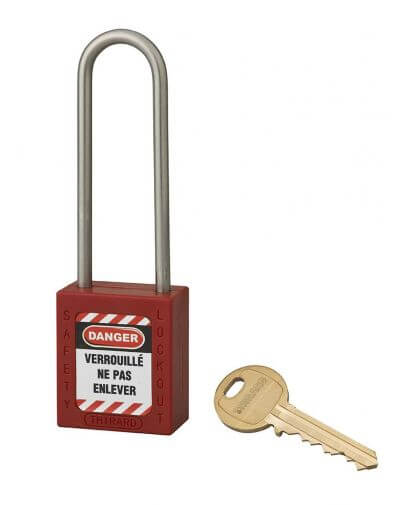 THIRARD veiligheidsslot, ideaal voor elektrische toepassingen, met een behuizing van ABS (niet-geleidend materiaal) en een roestvrijstalen deur, waardoor het bestand is tegen schokken, hitte en corrosie. Voor nog meer veiligheid beschikt dit industriële hangslot over een pinmechanisme en dubbele vergrendeling, evenals een ‘captive key’-functie (het hangslot moet gesloten zijn om de sleutel te kunnen verwijderen). Geleverd met een sleutel en een set labels. Optie om de automatische vergrendeling en ‘captive key’-functie uit te schakelen. Deze industriële veiligheidshangsloten hebben dezelfde opening, op verzoek is er de mogelijkheid om ze op te nemen in het hoofdsleutelsysteem, maar ook om individuele sleutels te leveren.