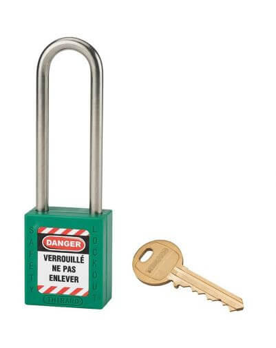 THIRARD veiligheidsslot, ideaal voor elektrische toepassingen, met een behuizing van ABS (niet-geleidend materiaal) en een roestvrijstalen deur, waardoor het bestand is tegen schokken, hitte en corrosie. Voor nog meer veiligheid beschikt dit industriële hangslot over een pinmechanisme en dubbele vergrendeling, evenals een ‘captive key’-functie (het hangslot moet gesloten zijn om de sleutel te kunnen verwijderen). Geleverd met een sleutel en een set labels. Optie om de automatische vergrendeling en ‘captive key’-functie uit te schakelen. Deze industriële veiligheidshangsloten hebben dezelfde opening, op verzoek is er de mogelijkheid om ze op te nemen in het hoofdsleutelsysteem, maar ook om individuele sleutels te leveren.