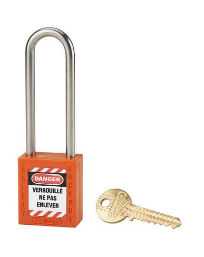 THIRARD veiligheidsslot, ideaal voor elektrische toepassingen, met een behuizing van ABS (niet-geleidend materiaal) en een roestvrijstalen deur, waardoor het bestand is tegen schokken, hitte en corrosie. Voor nog meer veiligheid beschikt dit industriële hangslot over een pinmechanisme en dubbele vergrendeling, evenals een ‘captive key’-functie (het hangslot moet gesloten zijn om de sleutel te kunnen verwijderen). Geleverd met een sleutel en een set labels. Optie om de automatische vergrendeling en ‘captive key’-functie uit te schakelen. Deze industriële veiligheidshangsloten hebben dezelfde opening, op verzoek is er de mogelijkheid om ze op te nemen in het hoofdsleutelsysteem, maar ook om individuele sleutels te leveren.