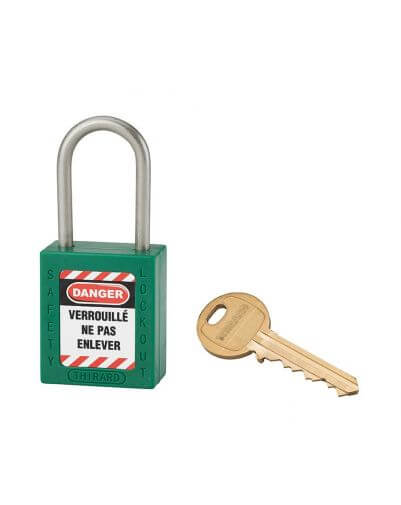 THIRARD veiligheidsslot, ideaal voor elektrische toepassingen, met een behuizing van ABS (niet-geleidend materiaal) en een roestvrijstalen deur, waardoor het bestand is tegen schokken, hitte en corrosie. Voor nog meer veiligheid beschikt dit industriële hangslot over een pinmechanisme en dubbele vergrendeling, evenals een ‘captive key’-functie (het hangslot moet gesloten zijn om de sleutel te kunnen verwijderen). Geleverd met een sleutel en een set labels. Optie om de automatische vergrendeling en ‘captive key’-functie op te heffen. Deze industriële veiligheidshangsloten hebben dezelfde opening, op verzoek is er de mogelijkheid om ze op te nemen in het hoofdsleutelsysteem, maar ook om individuele sleutels te leveren.