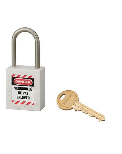 THIRARD veiligheidsslot, ideaal voor elektrische toepassingen, met een behuizing van ABS (niet-geleidend materiaal) en een roestvrijstalen deur, waardoor het bestand is tegen schokken, hitte en corrosie. Voor nog meer veiligheid beschikt dit industriële hangslot over een pinmechanisme en dubbele vergrendeling, evenals een ‘captive key’-functie (het hangslot moet gesloten zijn om de sleutel te kunnen verwijderen). Geleverd met een sleutel en een set labels. Optie om de automatische vergrendeling en ‘captive key’-functie uit te schakelen. Deze industriële veiligheidshangsloten hebben dezelfde opening, op verzoek is er de mogelijkheid om ze op te nemen in het hoofdsleutelsysteem, maar ook om individuele sleutels te leveren.