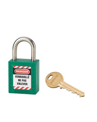 THIRARD veiligheidsslot, ideaal voor elektrische toepassingen, met ABS (niet-geleidend materiaal) behuizing en roestvrijstalen deur, waardoor het bestand is tegen warmteschokken en corrosie. Voor nog meer veiligheid beschikt dit industriële hangslot over een pin- en dubbel vergrendelingsmechanisme en een ‘captive key’-functie (het hangslot moet gesloten zijn om de sleutel te kunnen verwijderen) Geleverd met een sleutel en een set labels. Optie om de automatische vergrendeling en ‘captive key’-functie op te heffen. Deze industriële veiligheidshangsloten hebben dezelfde opening, op verzoek is er de mogelijkheid om ze op te nemen in het hoofdsleutelsysteem, maar ook om individuele sleutels te leveren.