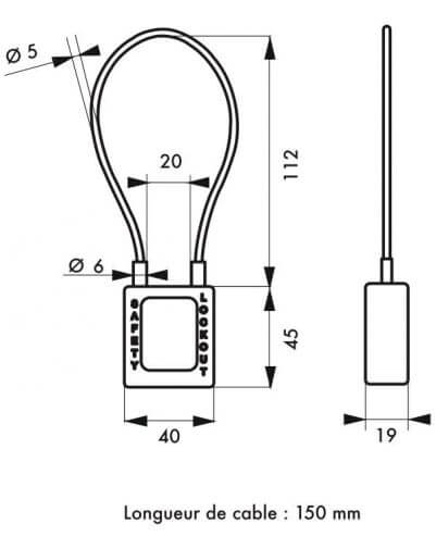 Behuizing uit één stuk in niet-geleidend ABS. Opgerolde roestvrijstalen kabel, diëlektrische en elektrostatische bescherming. Stiftmechanisme. Inclusief 1 messing sleutel en set labels. Bestand tegen schokken, hitte en corrosie.