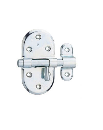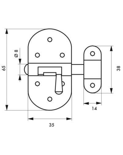 35 mm gebogen stalen plaat. Tegenplaat 14 mm gebogen staal. Ronde schuifgrendel Ø 8 mm. Ovale trekknop. Gegalvaniseerde afwerking.
