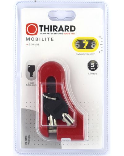 Dit anti-diefstal BLOCK MOTO remschijfslot is ontworpen door THIRARD om je motorfiets te beschermen tegen diefstal door de remschijf effectief te vergrendelen. De behuizing van gegoten legering biedt extreem hoge beveiliging tegen knippogingen en het buisvormige sleutelslotmechanisme wordt geleverd met twee sleutels om de toegang te delen of in geval van verlies.