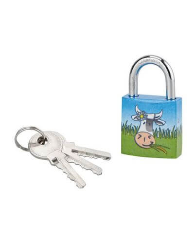 Het CHÂ’TIOTE MEUH sleutelslot, gemaakt van staal, is geschikt voor het beveiligen van lockers en garderobes, maar ook voor het afsluiten van deuren van garderobes of bagage. Bij dit veiligheidshangslot worden drie vernikkelde stalen sleutels geleverd, om de toegang te delen of in geval van verlies. Dit Thirard hangslot heeft een hoge slagvastheid en is gepersonaliseerd met afbeeldingen die passen bij de voorkeuren van kinderen en tieners.