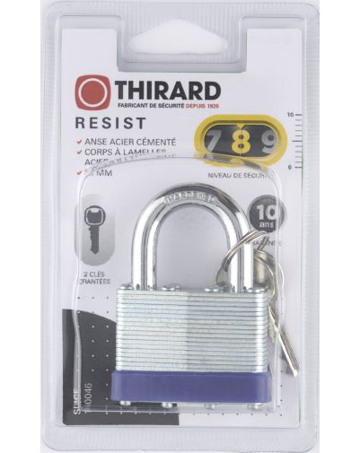 Het SLICE-sleutelslot is ontworpen voor gebruik binnen gebouwen, voor het effectief beveiligen van kasten en lades, kisten en kasten, deuren van kamers of bijgebouwen, enz. Het gelamelleerde lichaam van gegalvaniseerd staal zorgt voor een zeer hoge schokbestendigheid en een hoge mate van veiligheid. Bij dit hangslot van THIRARD worden twee sleutels geleverd, om de toegang te delen of in geval van verlies. De sleutel kan alleen worden gekopieerd volgens het model.