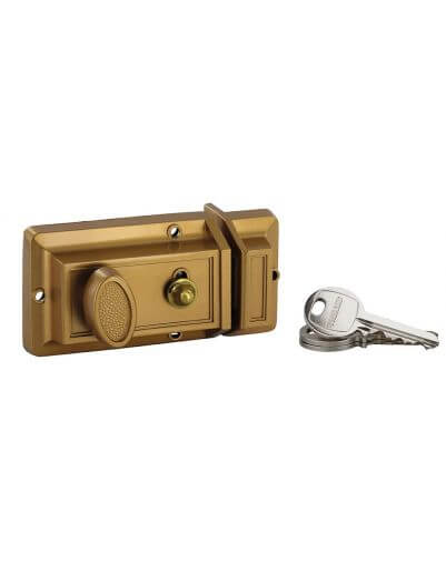 Slot, toegepast slot, 90 x 60 mm, RIM cilinder met 3 sleutels, extra sluitknop, goudkleurig, THIRARD