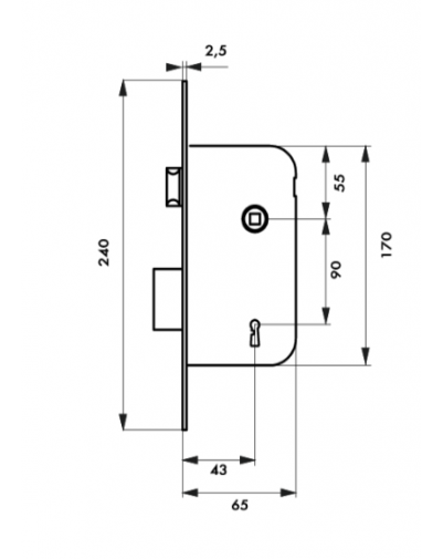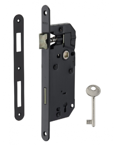 Getrokken stalen kast. Stalen voorplaat met afgeronde hoeken. Omkeerbare verende grendel zonder demontage van de behuizing. Gegalvaniseerde platte sluitbout. Stalen tegenplaat. Vierkant 8 mm. As 45 mm. Middenafstand 90 mm. Zwarte afwerking.