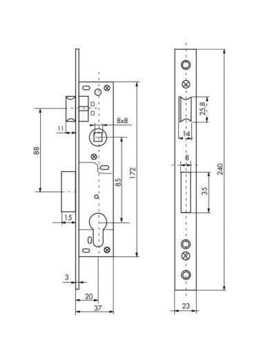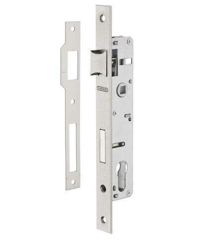 Gegalvaniseerde stalen behuizing. Stalen voorplaat. Omkeerbare veersluitgrendel zonder demontage van de behuizing. Platte vernikkelde legering slotbout. Stalen tegenplaat. Vierkant 8 mm. Spindel 20 mm. Hartafstand 85 mm. Voor metalen deuren. Voorbereiding Europese profielcilinder.
