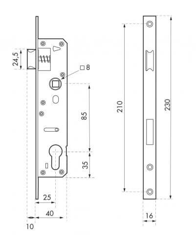 Gegalvaniseerde stalen behuizing. Roestvrijstalen voorplaat, 16 mm dik, met vierkante randen. Omkeerbare veersluitbout zonder demontage van de behuizing. Platte vernikkelde slotbout. Vierkant 8 mm. As 25 mm. Middenafstand 85 mm. Geen tegenplaat. Voor metalen schrijnwerkdeuren.