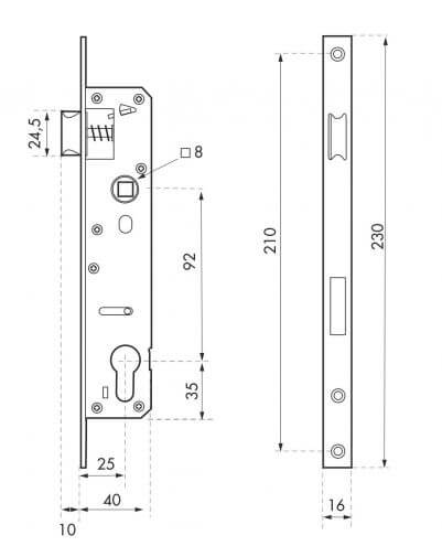 Gegalvaniseerde stalen behuizing. Roestvrijstalen voorplaat, 16 mm dik, met vierkante randen. Omkeerbare veersluitbout zonder demontage van de behuizing. Platte vernikkelde slotbout. Vierkant 8 mm. As 25 mm. Middenafstand 92 mm. Geen tegenplaat. Voor metalen schrijnwerkdeuren.