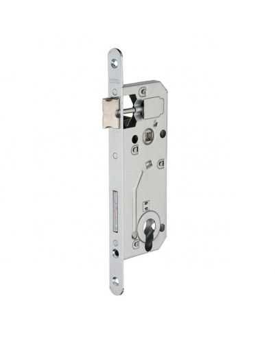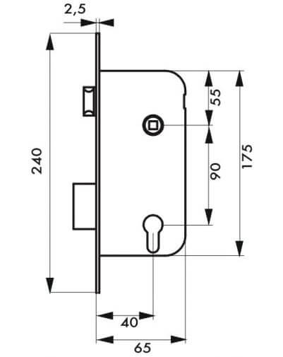 Getrokken stalen behuizing. Stalen voorplaat met afgeronde hoeken. Omkeerbare verende slotbout zonder demontage van de behuizing. Platte gegalvaniseerde legering slotbout. Vierkant 8 mm. As 40 mm. Middenafstand 90 mm. Cilindervoorbereiding met Europees profiel. Geen opening met 1/2-omwentelingssleutel.
