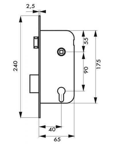 Getrokken stalen behuizing. Stalen voorplaat met afgeronde hoeken. Omkeerbare verende grendel zonder demontage van de behuizing. Vlakke vergrendelingspen in bichromaat verzinkte legering. Stalen tegenplaat. Vierkant 8 mm. As 40 mm. Centreerafstand 90 mm. Europese profielcilindervoorbereiding. Geen opening met 1/2-omwentelingssleutel.